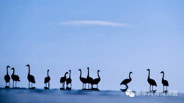 一群大天鹅,沐浴在青海湖冬日的晨光中