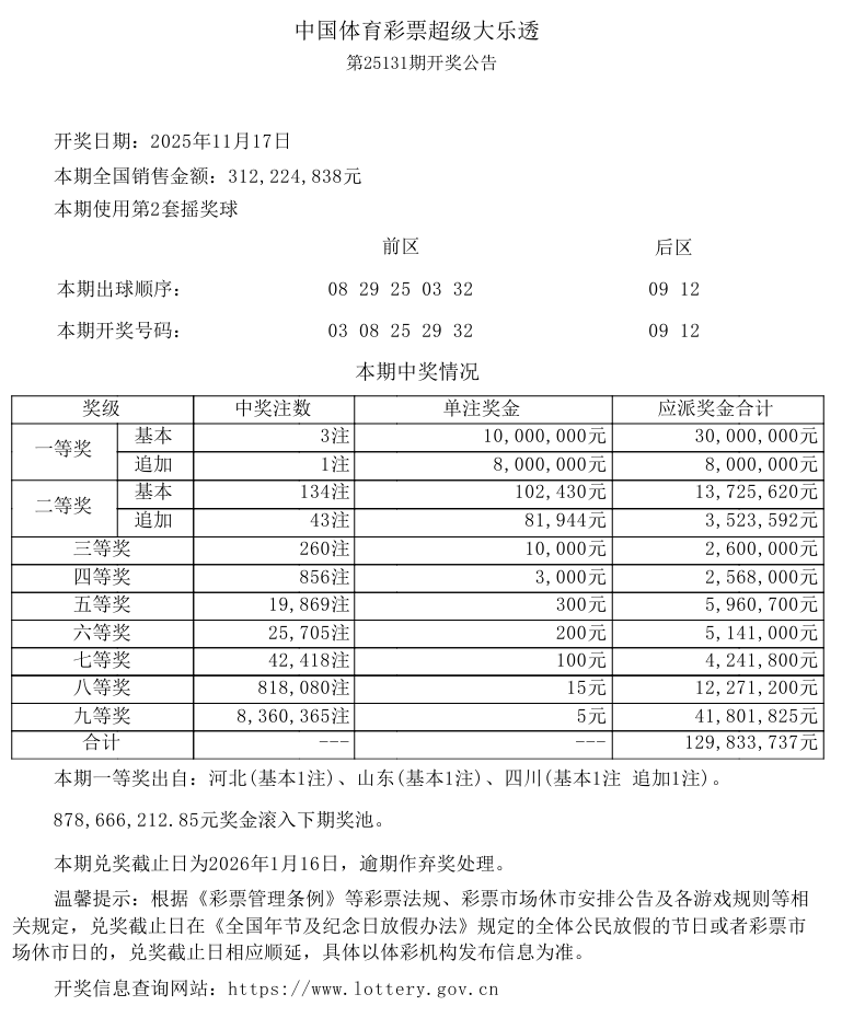超级大乐透开奖一等奖河北(基本1注)山东(基本1注)四川(基本1注 追加1注)奖池8.78亿元本期销量3.12亿元(点击图片可放大查看)