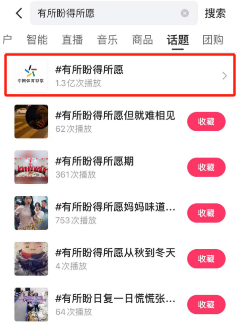为了让这份祝福突破票面的边界 中国体育彩票与快手联合发起 “有所盼得所愿”挑战赛 共有三个活动入口 方法一 在快手直接搜索 #有所盼得所愿 右滑选择话题按钮,直接进入话题页