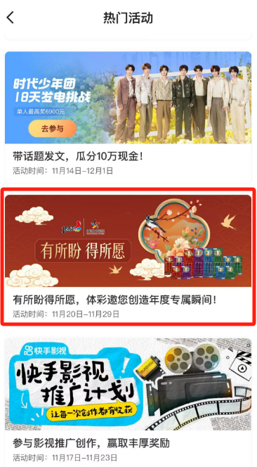 方法二 在快手首页点击左上角活动栏 进入“热门活动” 找到#有所盼得所愿