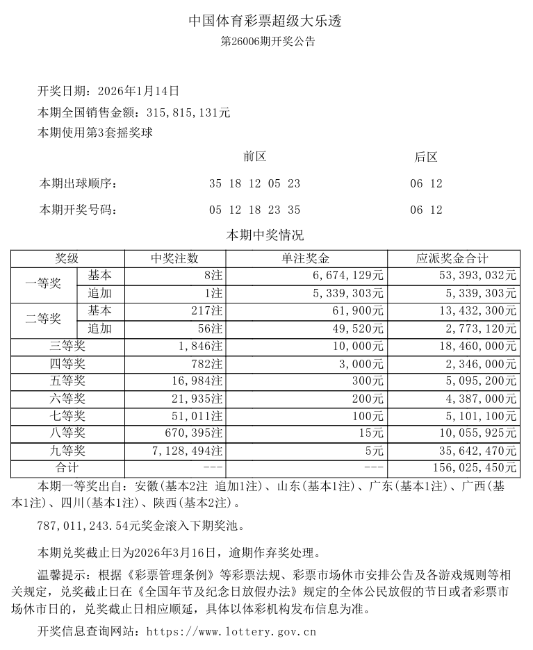 一等奖安徽(基本2注 追加1注)山东(基本1注)广东(基本1注)广西(基本1注)四川(基本1注)陕西(基本2注)奖池7.87亿元本期销量3.15亿元(点击图片可放大查看)