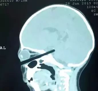 一名上海男孩,2岁多,因为帮助爷爷递镙丝刀,不慎跌跤,镙丝刀从眼眶插入颅内; 一男孩4岁不到,吃羊肉串时发生意外,硬铁丝生生地从鼻腔进入颅脑鞍区,由于伤口愈合不良,喝水时从鼻子流出;