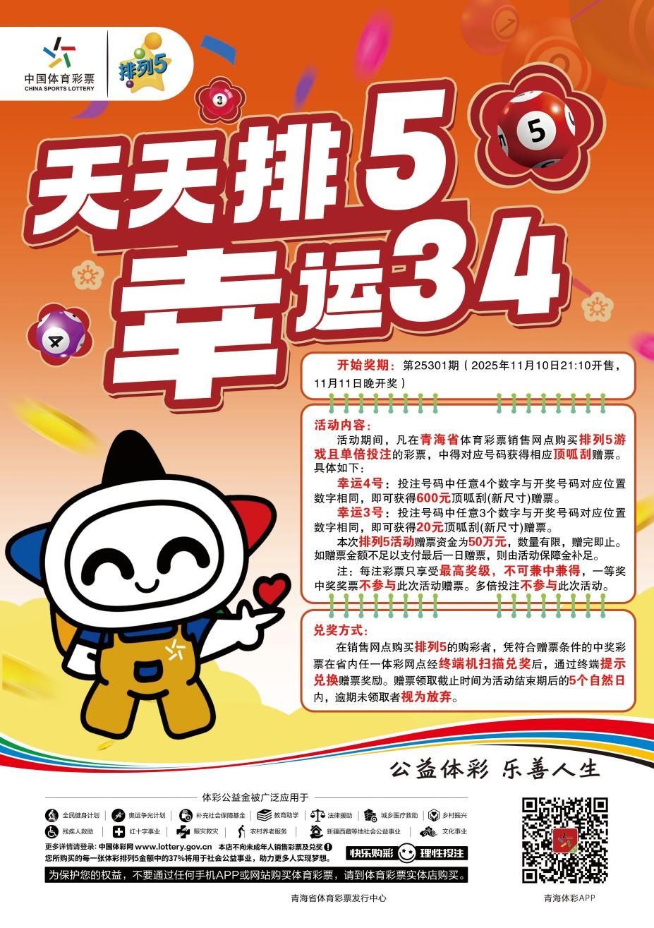 本次活动自排列5游戏第25301期起正式启动,该期彩票于2025年11月10日21:10开售,11月11日开奖。活动期间,凡在青海省体育彩票销售网点购买排列5单倍投注彩票的购彩者,即可参与赠票活动。根据规则,投注号码中任意4个数字与开奖号码对应位置数字相同,可获600元顶呱刮(新尺寸)赠票;任意3个数字对应位置相同,可获20元顶呱刮(新尺寸)赠票。需注意的是,每注彩票仅享受最高赠票奖级,不可兼中兼得。一等奖中奖奖票不参与赠票活动。多倍投注不参与此次活动。 此次活动赠票资金共计50万元,赠票数量有限,先到先得,赠完即止。若赠票金额不足以支付活动最后一日赠票费用,将由活动保障金补足。符合赠票条件的购彩者,可凭中奖彩票在青海省任一体彩销售网点,经终端机扫描兑奖后,按终端提示兑换赠票奖励。赠票领取截止时间为活动结束期后的5个自然日内,逾期未领取将视为自动放弃。 未来,青海体彩将持续推出更多优质活动,希望能为喜爱体彩的您带来购彩乐趣的同时,助力国家公益事业发展。