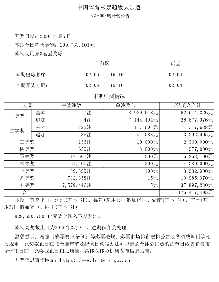 一等奖河北(基本1注)福建(基本1注 追加1注)湖南(基本1注)广西(基本3注 追加3注)四川(基本1注)奖池8.29亿元本期销量2.99亿元(点击图片可放大查看)