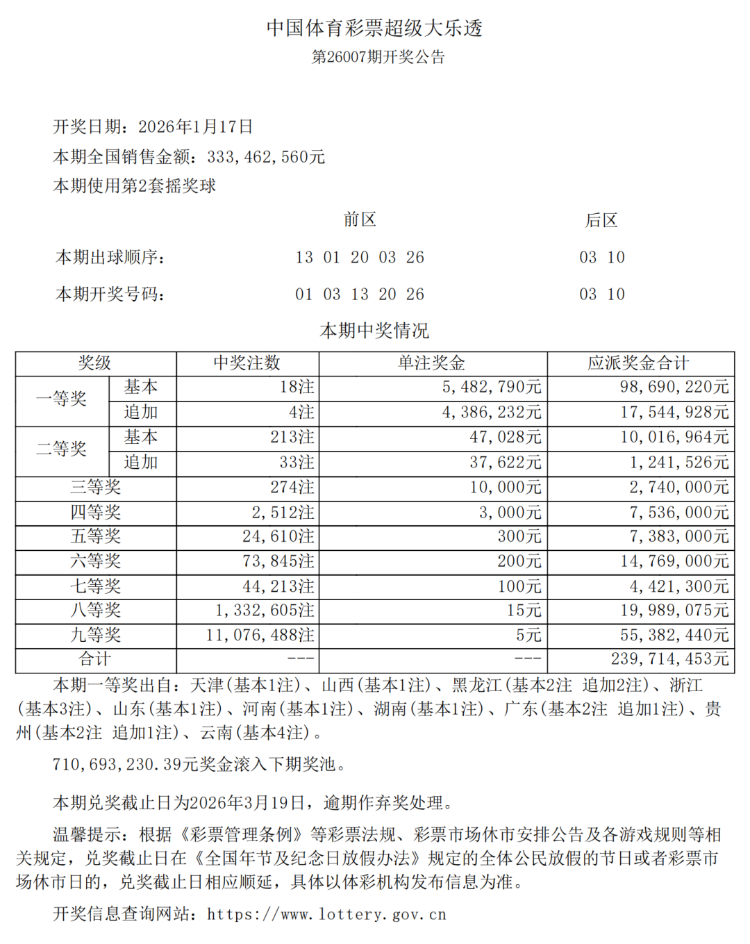 超级大乐透第26007期开奖公告